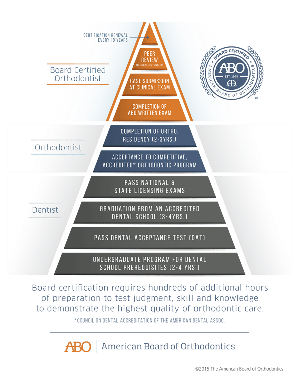 No. All orthodontists must be licensed to practice, but at this time only 1 in 3 orthodontists have continued on to become a board certified orthodontist. The American Board of Orthodontics (ABO) certification process signifies a unique achievement—a significant step beyond the two to three years of advanced education required for a dentist to become a specialist in orthodontics. The process requires the orthodontist to demonstrate actual accomplishments in patient care with detailed case reports on the treatment provided for a broad range of patient problems. Board certification is a voluntary achievement that all orthodontists do not choose to pursue. In order to become board certified by the ABO, an individual orthodontist is thoroughly interviewed by a highly respected panel of examiners to demonstrate their orthodontic knowledge, clinical skills and judgment.